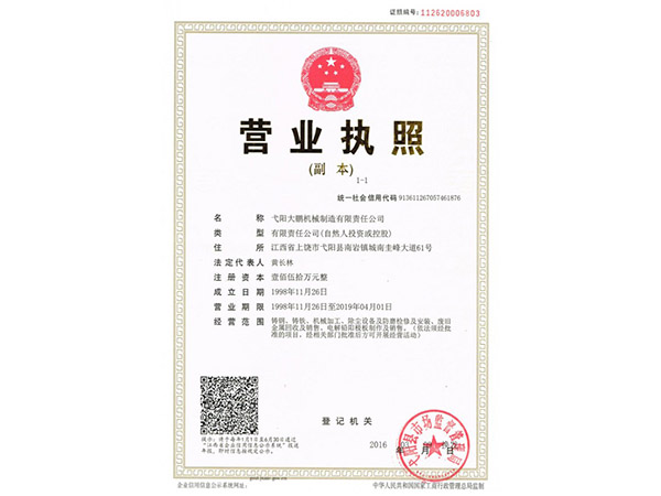 • 09-28弋陽大鵬機(jī)械制造有限責(zé)任公司成功取得規(guī)范